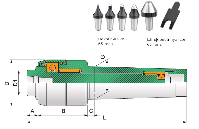 Принадлежности 65 типовых наконечников и 65 типовых пуансонов.